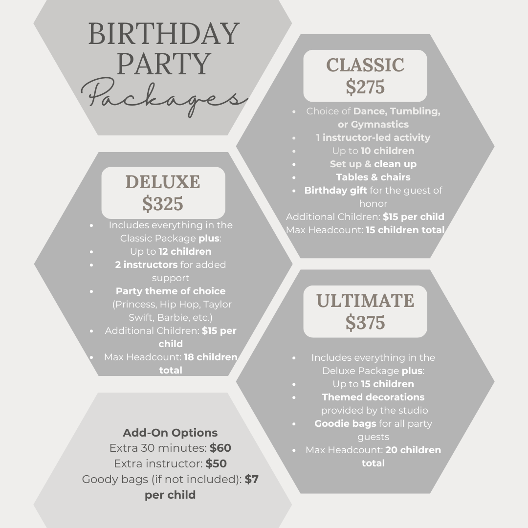 We’re excited to announce our updated birthday party packages! Starting January 1, 2026, we’re offering new options designed to best fit your birthday party needs. Whether you’re looking for a fun dance-themed celebration or a memorable activity-filled party, we have a package that’s perfect for your special day. Celebrate with us and make your child’s birthday unforgettable!